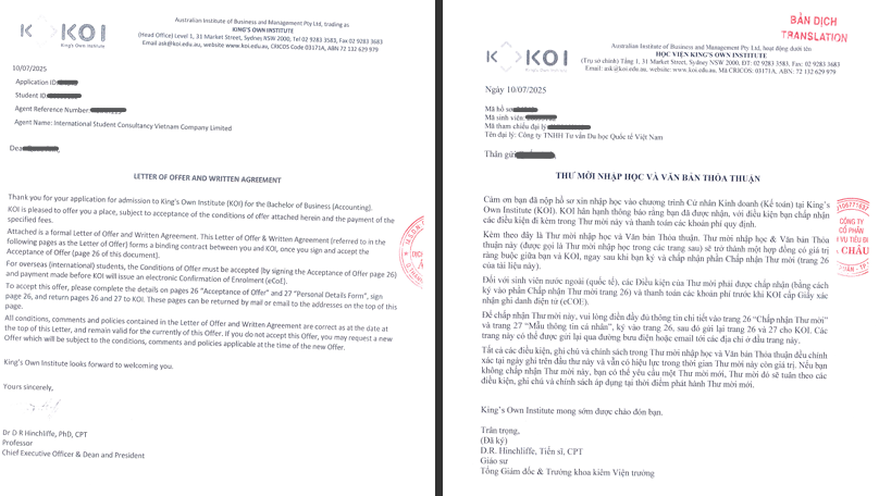 对于在海外入学的情况,学校签发的 录取通知书 (Offer Letter/Admission Letter) 通常为英文。提交至当地兵役机关时,申请人必须附上 经认证的越南文翻译件